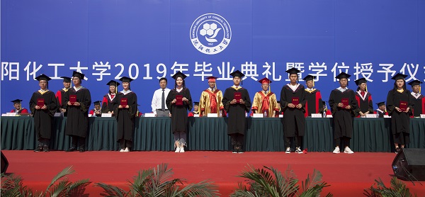 副校长袁德成宣读《万象城体育awcsport关于2019届本科生、研究生、留学生准予毕业和学位授予的决定》。校长许光文为全校毕业生代表颁发毕业证、授予学位,并为他们拨苏正冠,与其合影留念。