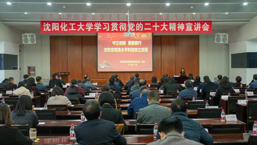 宣讲会上,姜妍以《守正创新 勇毅前行 加快实现高水平科技自立自强》为题,围绕党的二十大基本情况,会议主题和重大意义,报告全文学习,报告金句和同声共鸣,守正创新、勇毅前行五个方面作报告。姜妍以“人民、现代化、创新、教育、掌声、发言、手机、笔记”为关键词,通过开会、投票和合影过程以及接受中央电视台、新华社、光明日报等媒体采访情况与大家分享了党的二十大会场盛况。她指出,党的二十大是在全党全国各族人民迈上全面建设社会主义现代化国家新征程、向第二个百年奋斗目标进军的关键时刻召开的一次十分重要的大会,对鼓舞和动员全党全国各族人民坚持和发展中国特色社会主义、全面建设社会主义现代化国家、全面推进中华民族伟大复兴具有重大意义。她表示,将充分发挥党员先锋模范作用,走好科技创新之路,积极投身原产品升级、新产品开发,努力把关键核心技术掌握在我们自己手里。她鼓励化大师生勇于创新,勇攀高峰,为推进辽宁高质量发展,推动新时代东北振兴做出更大贡献。