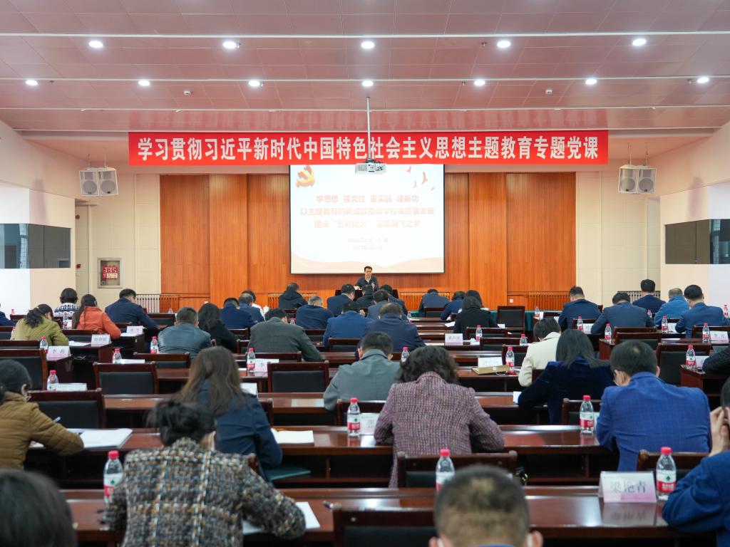 4月27日下午,校党委书记王强围绕学习贯彻习近平新时代中国特色社会主义思想,特别是关于教育的重要论述,以《学思想 强党性 重实践 建新功 以主题教育的新成效推动学校高质量发展 建设“五彩化大” 实现腾飞之梦》为题讲授专题党课。党委副书记周志强、副校长金志浩、纪委书记牛巨龙以及全体中层干部参加学习。