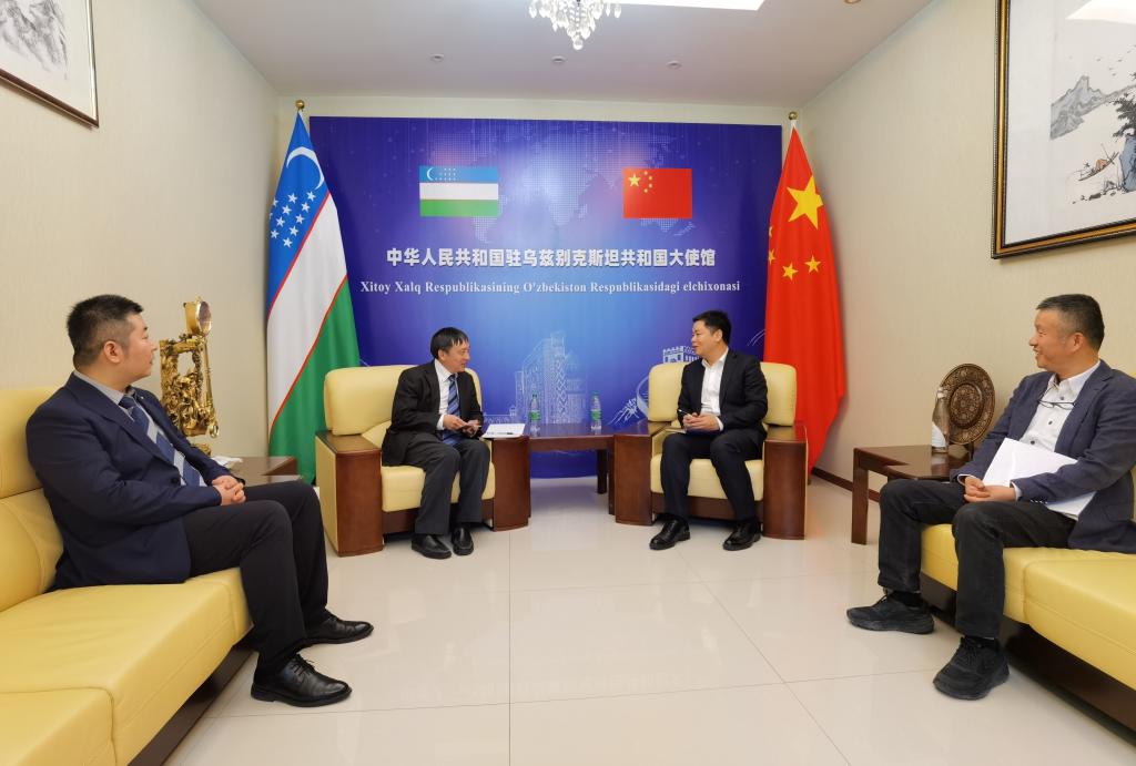 访问期间,许光文一行拜访了我国驻乌兹别克斯坦大使馆,大使馆经济商务处二等秘书刘洋等接待许光文一行。刘洋对许光文校长一行表示热烈欢迎,介绍了乌兹别克斯坦基本情况和“一带一路”在乌建设情况。许光文校长对大使馆的会面安排表示衷心感谢,并介绍了学校发展情况和此行与相关高校、企业开展合作的意向与设想。刘洋对学校加强与“一带一路”国家的教育、科技和人才合作给予高度评价,并表示在大使馆的职责范围内将全力支持万象城与乌方的各项合作。