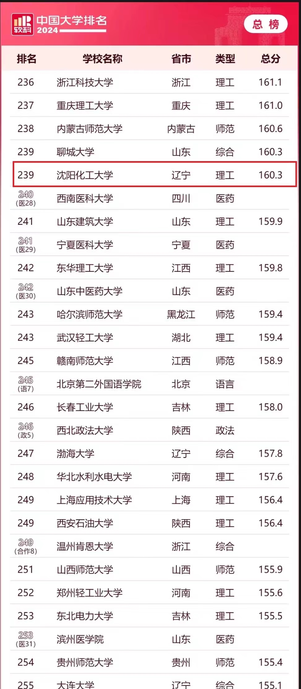 沈阳化工大学软科近年来全国排名变化: