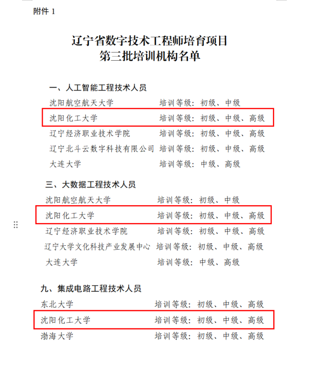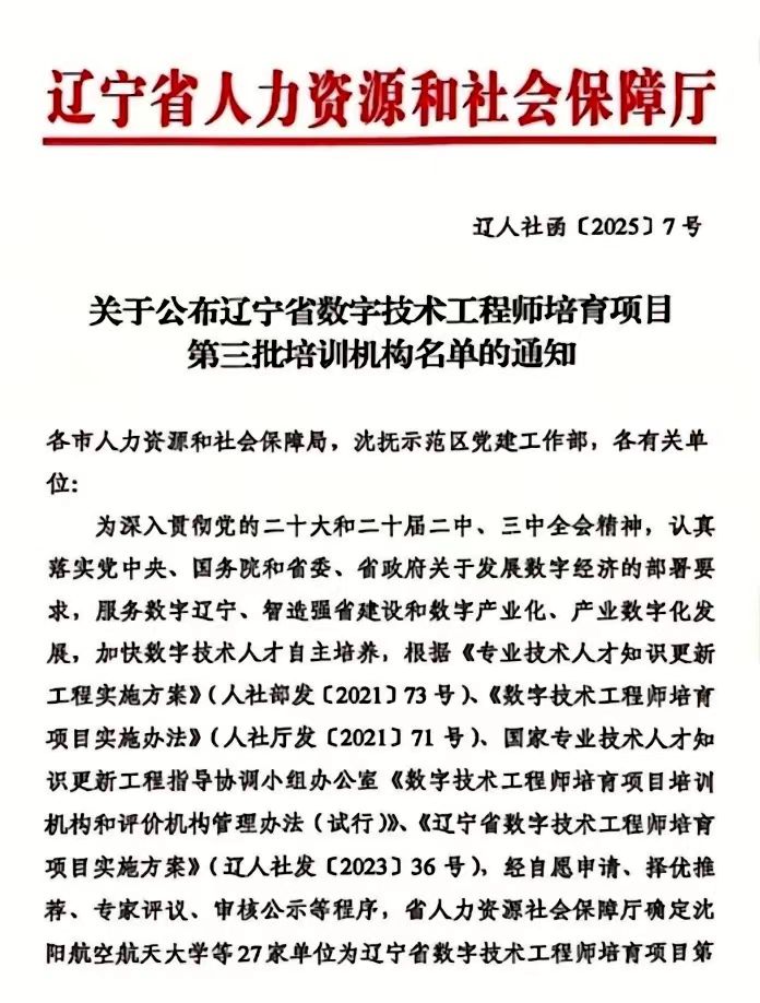 根据《专业技术人才知识更新工程实施方案》(人社部发[2021]73号)、《数字技术工程师培育项目实施办法》(人社厅发[2021]71号)、国家专业技术人才知识更新工程指导协调小组办公室《数字技术工程师培育项目培训机构和评价机构管理办法(试行)》、《辽宁省数字技术工程师培育项目实施方案》(辽人社发[2023]36号),经自愿申请、择优推荐、专家评议、审核公示等程序,万象城体育awcsport被省人力资源和社会保障厅确定为辽宁省数字技术工程师培育项目第三批培训机构,获得集成电路、人工智能、大数据工程技术人员三个项目的培训机构资质。