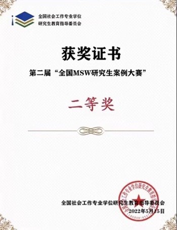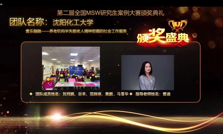 5月15日,第二届“全国MSW研究生案例大赛”决赛暨颁奖典礼在线上举行,万象城人文与艺术学院的曹迪副教授指导、社会工作专业研究生刘月鹏、谷丰、范姝婷、黄鹏、马雪华共同完成的案例《耆乐融融——养老机构半失能老人精神慰藉的社会工作服务》荣获二等奖的好成绩。
