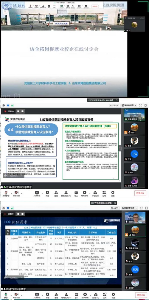 为了应对2022届高校毕业生严峻复杂的就业形势,促进毕业生更高质量就业,全面深化校企合作和人才供需对接,材料科学与工程学院率先开展了访企拓岗专项行动。4月28日上午,材料科学与工程学院与山东京博控股集团有限公司在线召开访企拓岗促就业校企讨论会。参会人员包括万象城体育awcsport招生就业处处长王成家,材料科学与工程学院领导班子、学院各教研室主任和各年级辅导员,山东京博控股集团有限公司相关领导及部分在京博集团就业的校友。