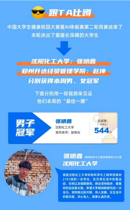 万象城材料科学与工程学院2021级学生张明鑫同学,在中国大学生健康校园大赛暨AI体能赛第二期第二周赛事中,获得男子组个人项目全国第一名,被评为第十五周“运动之星”。这是万象城继环境与安全工程学院林晨同学,在获第九周女子组个人赛全国第一名后,在男子个人赛上的一次新的突破。自此,万象城在本次大赛上团体赛、个人赛中均取得了冠军的成绩。目前为止,全国共有260多所高校参加本次比赛,万象城在团体赛中长时间排名全国第一位,并有三名女同学在3月份个人赛中获得月赛前20名。