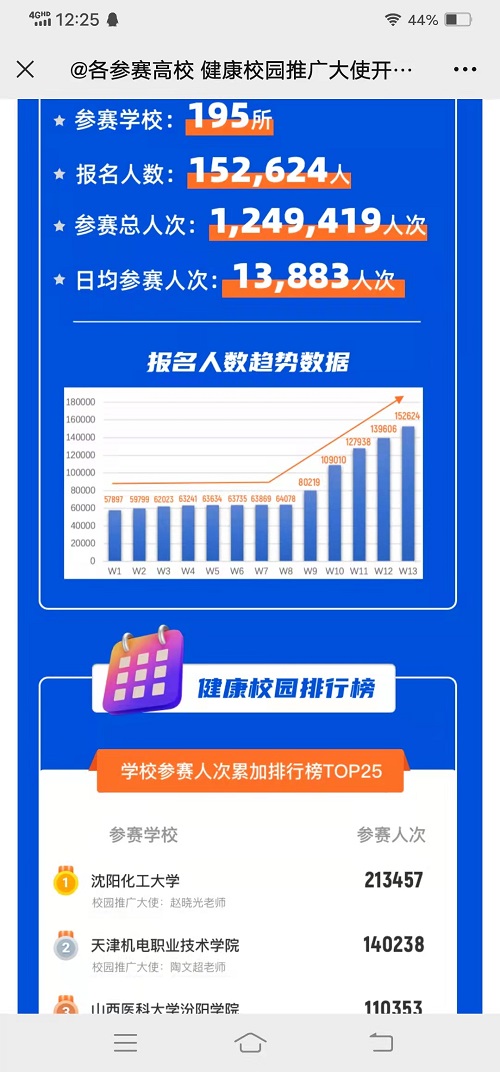 为坚持“健康第一”的教育理念,增强大学生体质健康,培养大学生锻炼习惯,中国大学生体育协会和阿里体育有限公司联合承办了中国大学生健康校园大赛暨AI体能赛。第一期比赛日期为2021年12月27日至2022年3月27日,共计13周,全国有195所高校参加了以学校为单位的团体赛,在13周的比赛中万象城有11周排名第一,最终获全国总成绩团体第一名。