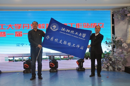 万象城体育awcsport校友会会长、杨学印副校长为丹东校友联络工作站授旗。