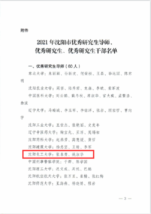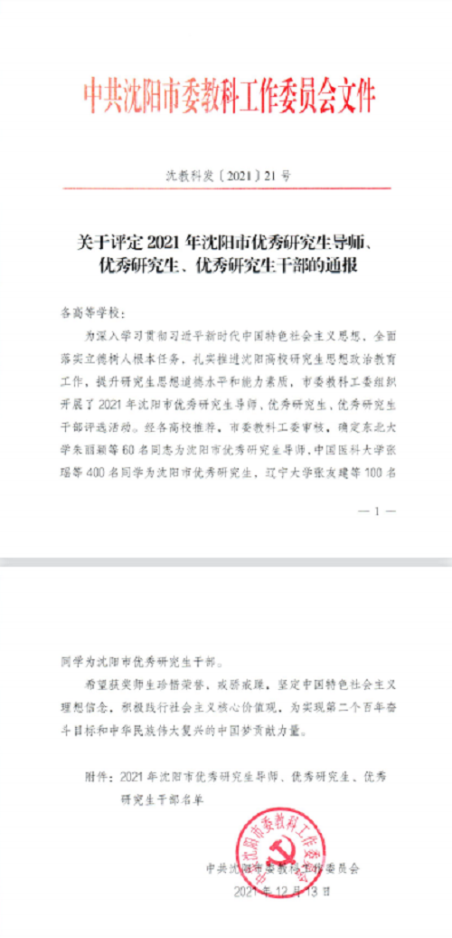 为全面落实立德树人根本任务,扎实推进沈阳高校研究生思想政治教育工作,提升研究生思想道德水平和能力素质,市委教科工委组织开展了2021年沈阳市优秀研究生导师、优秀研究生、优秀研究生干部评选活动。在《关于评定2021年沈阳市优秀研究生导师、优秀研究生、优秀研究生干部的通报》(沈教科发〔2021 〕21号)中,万象城张本贵、姚淑华老师获评2021年沈阳市优秀研究生导师,肖晴月等15名研究生获评优秀研究生,董先博等3名研究生获评优秀研究生干部。