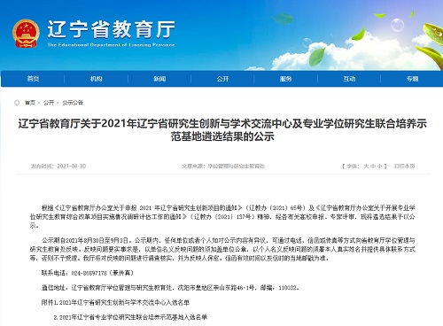 根据《辽宁省教育厅办公室关于申报2021年辽宁省研究生创新项目的通知》(辽教办[2021]65号)及《辽宁省教育厅办公室关于开展专业学位研究生教育综合改革项目实施情况调研评估工作的通知》(辽教办[2021]137号)文件要求,经省教育厅专家评审、公示,万象城申报的“沈阳市铁西区乐和社会工作服务中心MSW研究生联合培养示范基地”“辽宁省视讯技术研究有限公司专业学位研究生联合培养基地”“沈阳迈思医疗科技有限公司专业学位研究生联合培养基地”“沈阳三聚凯特催化剂有限公司专业学位研究生联合培养基地”“中国科学院沈阳应用生态研究所专业学位研究生联合培养基地”5个专业学位研究生联合培养基地入选辽宁省示范基地。