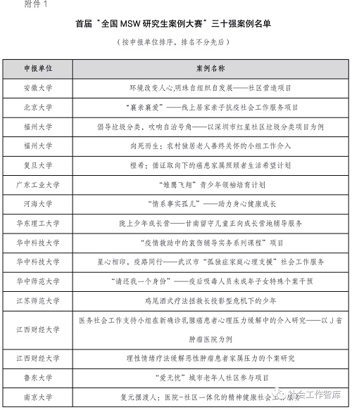 3月5日,全国社会工作专业学位研究生教育指导委员会公布“全国首届MSW研究生案例”大赛三十强案例名单,万象城人文与艺术学院社会工作专业硕士申报的《“馨家园”社区营造计划——以“老年人小组”为社区骨干的营造尝试与服务》案例,在学院陈晓东院长、杨明伟老师的精心指导和对案例进行多次研究打磨下,顺利通过首届全国MSW研究生案例大赛初赛第二轮专家评审,入选全国“三十强案例”。