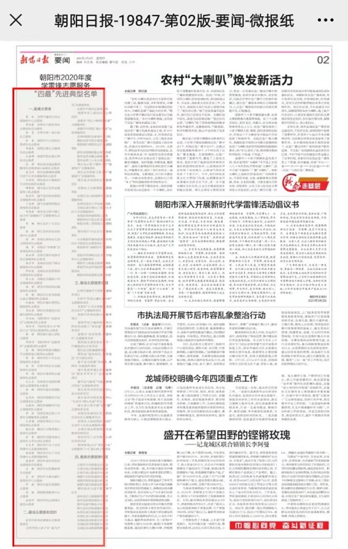 喀左县甘招镇王营子村第一书记石满祥组建的“道德银行”志愿服务队荣获朝阳市2020年度学雷锋志愿服务最佳服务组织荣誉称号。“道德银行”志愿服务队自组建以来,石满祥联系学校专业教师为志愿服务队授课,促成学校与地方签署合作协议,建立乡村“道德银行”社会工作服务站。志愿服务队多次组织清洁家园、关爱五保老人等活动,传递正能量,展示新风采,为建设美丽和谐乡村作出了贡献。