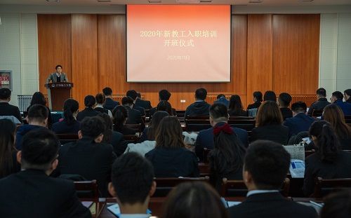 仪式上,孙宏灵副部长宣读了《2020年新教工入职培训方案》。与会领导为新教工佩戴校徽、颁发《新起点》入职教育手册。70名新教工正式加入学校大家庭,与学校同呼吸、共奋进,开启实现新时代“化大梦”新征程。于三三处长带领全体新教工庄严宣誓,“忠诚党的教育事业,履行教书育人职责,为教育发展、国家繁荣和民族振兴努力奋斗”!