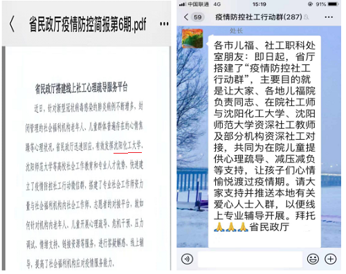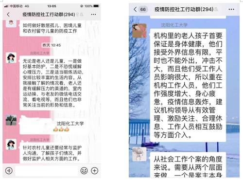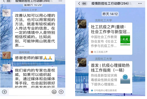 近日,辽宁省民政厅建立了专业服务疫情防控微信群,搭建专业社会工作师资力量与社会福利机构社会工作师和志愿者的对接平台。万象城体育awcsport社会工作专业和负责心理健康教育的十余名教师积极参与,发挥自身的专业优势,为社会福利机构的工作人员答疑解惑,助力疫情防控。连续几日,学校多名专业教师为省内机构工作人员互动,提供疫情防控、心理健康、危机干预等各类专业资料。