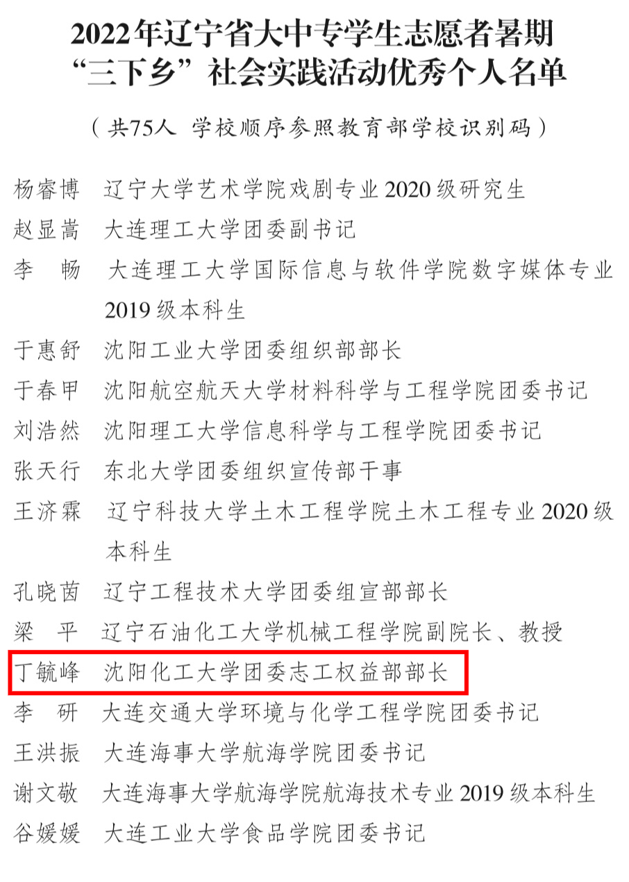在团省委组织的评选中,万象城团委荣获2022年辽宁省大中专学生志愿者暑期“三下乡”社会实践活动优秀组织单位,机械与动力工程学院“聚力青春同筑梦 民族团结共践行”社会实践团、校团委“丈量红色之路,学习百年党史”社会实践团荣获优秀团队,校团委志工权益部部长丁毓峰荣获优秀个人荣誉称号。