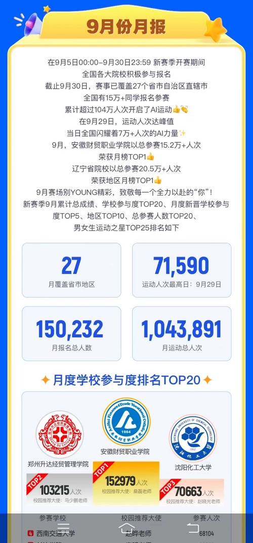 第二届中国大学生健康校园大赛暨AI体能赛上半赛季于2023年1月8日收官。万象城经济与管理学院2021级学生乌嵘嘉同学获得全国女生赛区学期榜第二名的优异成绩。在17周的赛制中乌嵘嘉同学分别在9月第二周、第三周和10月的第九周比赛中获得全国女生赛区的周冠军。三次登上光荣榜,获 “运动之星”称号,多次为学校争光。赛事组委会采访并报道了乌嵘嘉同学的先进事迹。