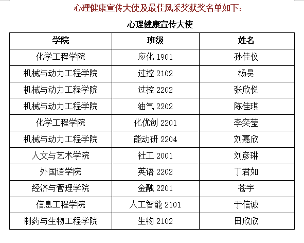 大会第一项进行“心理健康宣传大使评选决赛”。共有20名选手入围决赛,每名选手以“暖阳心旅,朋辈同行”为主题进行演讲,由评委现场打分,最终孙佳仪等11名选手获得“心理健康宣传大使”称号,易文辉等9名选手获得“最佳风采奖”。