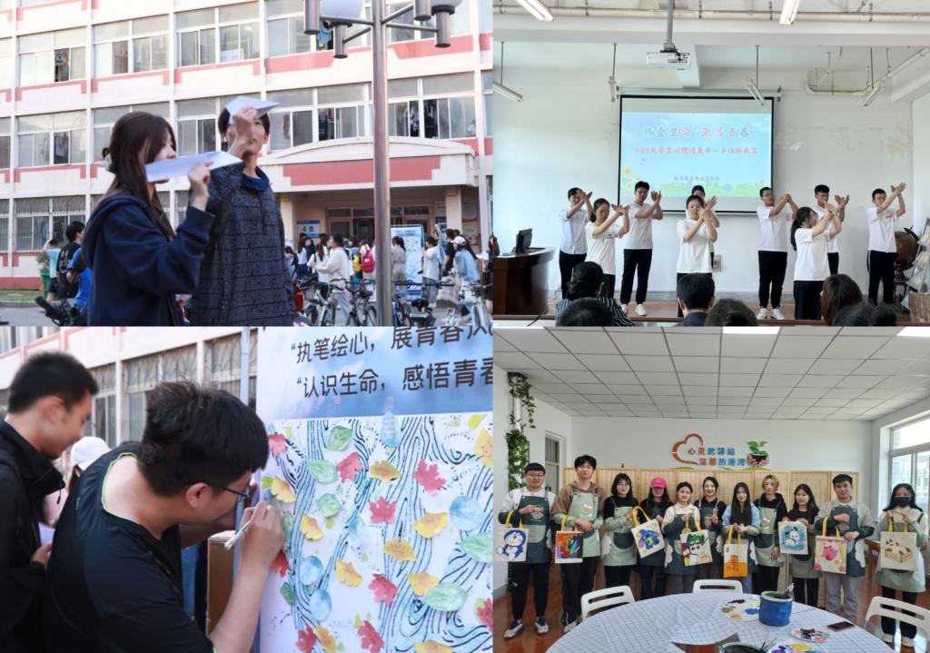 开展以“热爱生命,激昂青春”为主题的文体活动。举办“以美育心——艺术心理体验活动”,借助艺术疗愈(涂鸦帆布包、彩泥多肉装饰画、端午节五彩手绳DIY)的形式启发大学生与自己的情绪“做朋友”;“共创生命之树、安慰盲盒、放飞烦恼和云朵树洞”等活动帮助同学们积极乐观地拥抱生活;手语操比赛、拔河比赛、合唱比赛以及心理电影观影活动,以多种方式引导在校生构建理性平和的积极心态。