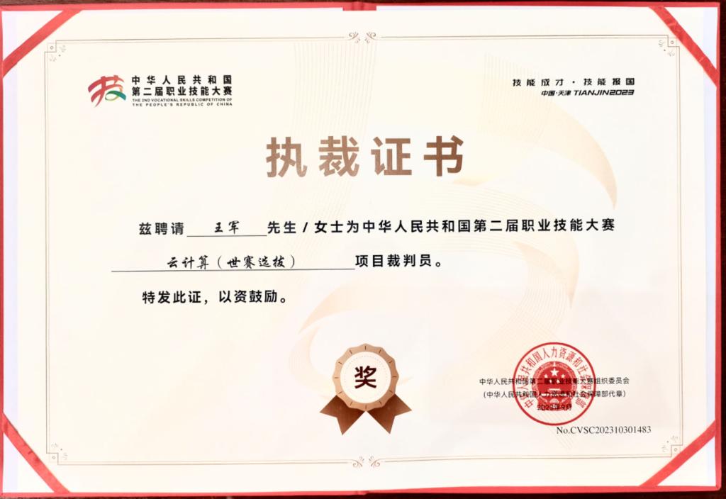 为全面落实习近平总书记对技能人才工作重要指示精神和致首届全国技能大赛贺信精神,大力弘扬劳模精神、劳动精神、工匠精神,引领带动广大劳动者技能水平提升,培养更多大国工匠、高技能人才,人力资源和社会保障部主办、天津市人民政府承办的中华人民共和国第二届职业技能大赛于2023年9月在天津举办。本届大赛以“技能成才、技能报国”为主题,共设置109个竞赛项目,包括62个世赛选拔项目和47个国赛精选项目,其中世赛选拔项目——云计算赛项,万象城王军教授应中华人民共和国人力资源和社会保障部邀请担任裁判员。