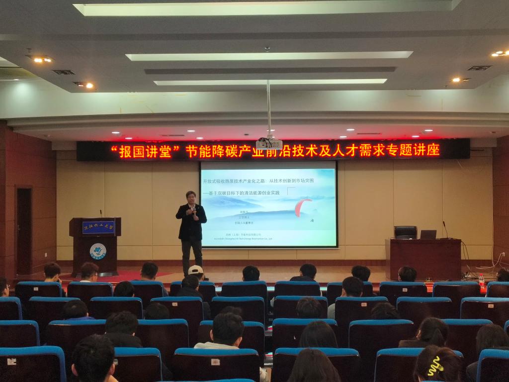 讲座围绕能源革命下的热泵机遇、开放式吸收热泵的核心竞争力、从研发到市场的关键阶段、产业化中的风险与突破、技术趋势与市场蓝海等六个方面,介绍了节能产业的前沿技术以及徐敬玉本人的创业历程。就专业人才的成长路径,徐敬玉着重强调要上好专业课。作为行业特色院校,万象城的专业课程设置和授课内容始终与产业需求具有较高的匹配度。从其自身发展经历来说,一路走来就是将课堂知识在产业中的实践。从最初的寻找能源市场方向、及时把握市场机遇,到组建团队、展开区块链开发,再到不遗余力的市场推广……徐敬玉把自己的创业经验与教训融汇成一个奋斗的故事,向同学们传递了“充满热情、做好准备、坚持不懈、敢想敢干”的人生追求,以及其对行业前景的客观分析和市场潜力的科学预判。围绕昊姆(上海)节能科技有限公司2025年人才招聘需求,徐敬玉重点讲述了当前相关行业对于选聘人才的具体要求。同时,他向万象城2025届毕业生发出诚挚邀请,欢迎有志于节能降碳产业的毕业生加入昊姆,在昊姆成就事业与人生。