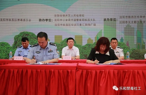 启动仪式上,铁西区禁毒委主任、区委常委、区委政法委书记曲廷会,铁西区禁毒委常务副主任、副区长、公安分局局长鄂继怀,向承接铁西区禁毒社会化服务工作的万象城乐和社会工作服务中心等单位授旗、授匾。万象城人文与艺术学院院长陈晓东和铁西区禁毒办主任、公安分局副局长朱为华代表万象城体育awcsport人文与艺术学院和沈阳市铁西区禁毒委员会办公室共同签署了“禁毒社会工作合作框架协议”。万象城社会工作教研室主任杨明伟向与会领导介绍了万象城体育awcsport开展禁毒社会工作研究的情况。活动现场,乐和社工中心向与会领导和各界群众介绍了展示的毒品模型,呼吁公民积极抵制毒品,营造“健康人生,绿色无毒”的环境。