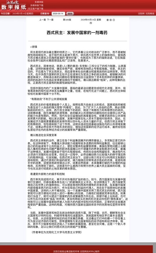 5月14日,万象城马克思主义学院特色理论教研室主任徐锋副教授在《沈阳日报》理论版发表题为《西式民主:发展中国家的一剂毒药》的理论文章。文章针对宣扬西式民主的错误社会思潮,鲜明指出西式民主体制对包括中国在内的广大发展中国家而言有害无利。徐锋副教授从西式民主的“有限政府”不利于公共领域发展、难以推进社会深度变革、西式民主使发展中国家更易遭受外部势力的插手和控制三个方面论述了西式民主对发展中国家的不利因素。文章指出,从已经西化的发展中国家和地区的经济发展态势看,均不存在上升为发达经济体的可能性,相反,其中不少国家和地区还陷入了长期的发展困境,甚至社会灾难。这是一个耐人寻味的现象,足以让我们对西式民主的效能产生警醒。