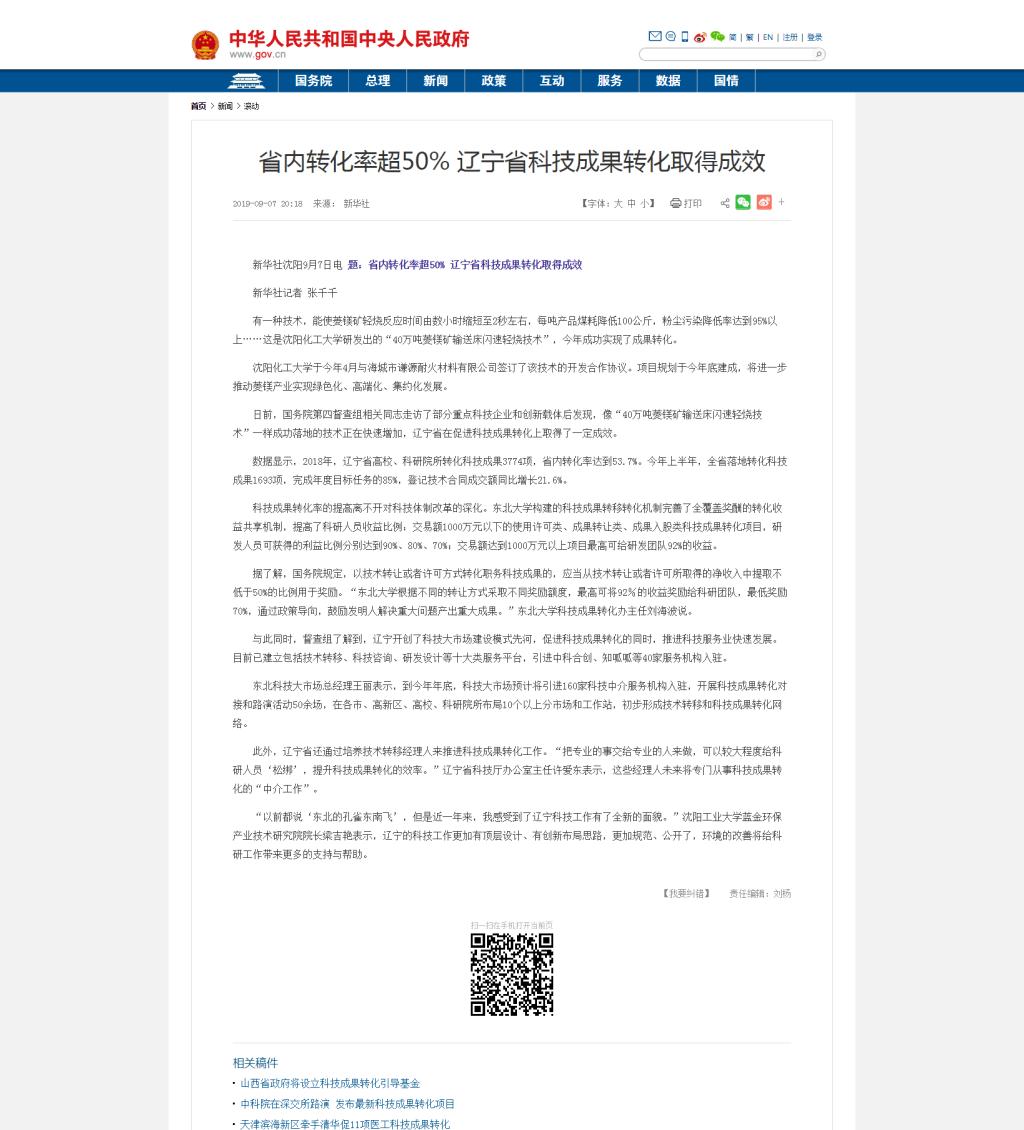 9月7日,国务院网站刊登新华社记者张千千采写的新闻《省内转化率超50% 辽宁省科技成果转化取得成效》。该新闻对万象城“40万吨菱镁矿输送床闪速轻烧技术”在海城落地事宜进行了报道。现将该新闻转载如下: