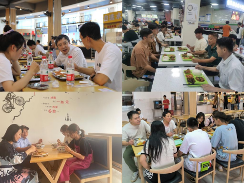 中午12时,校领导们来到食堂与同学们共进午餐。
