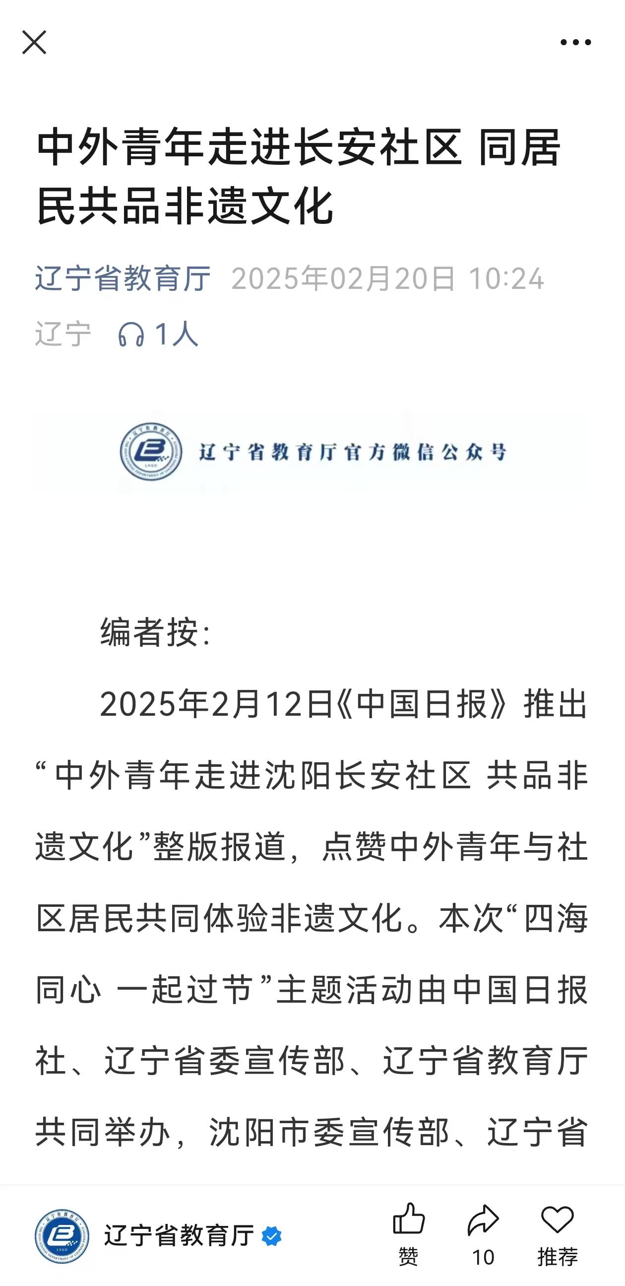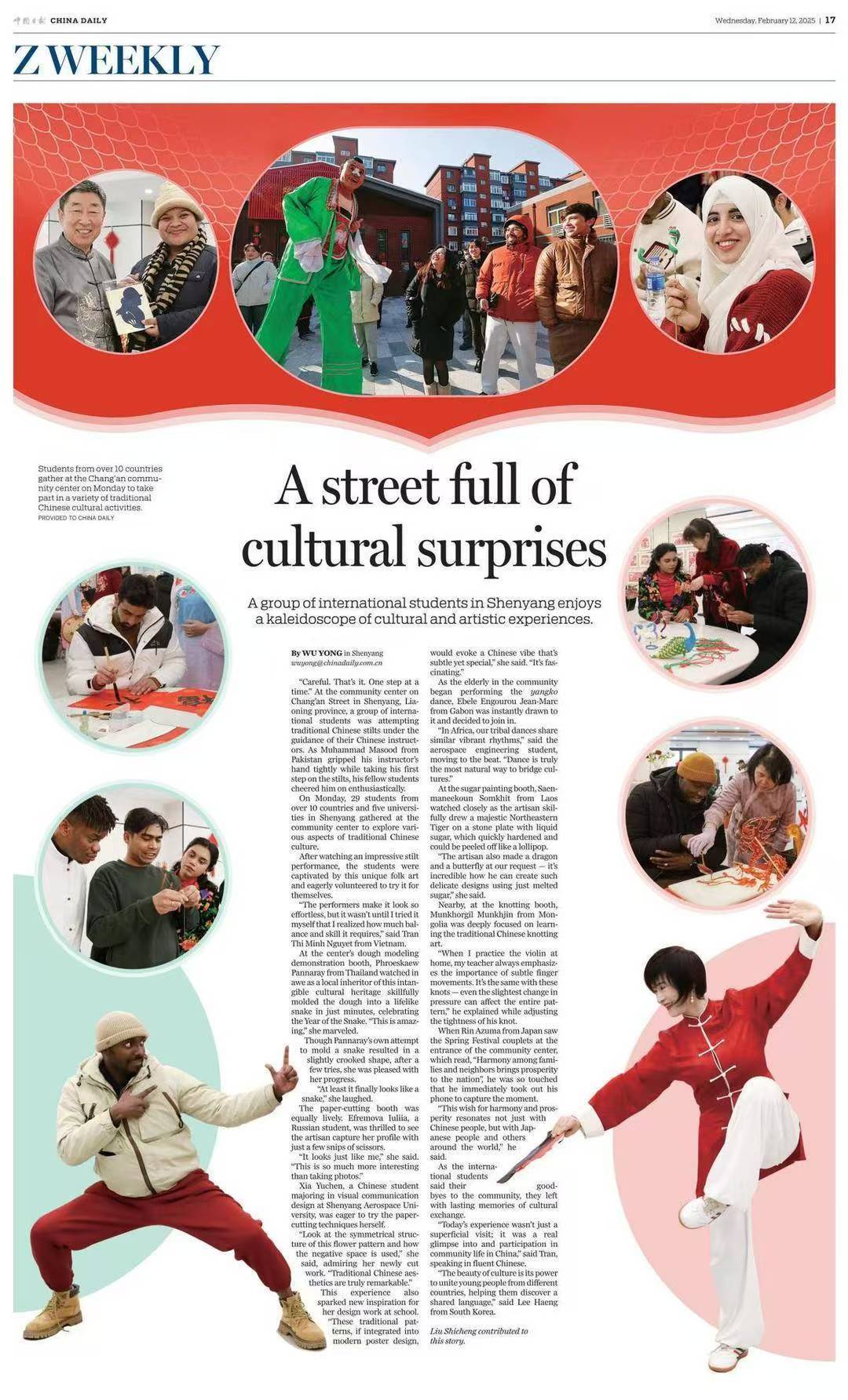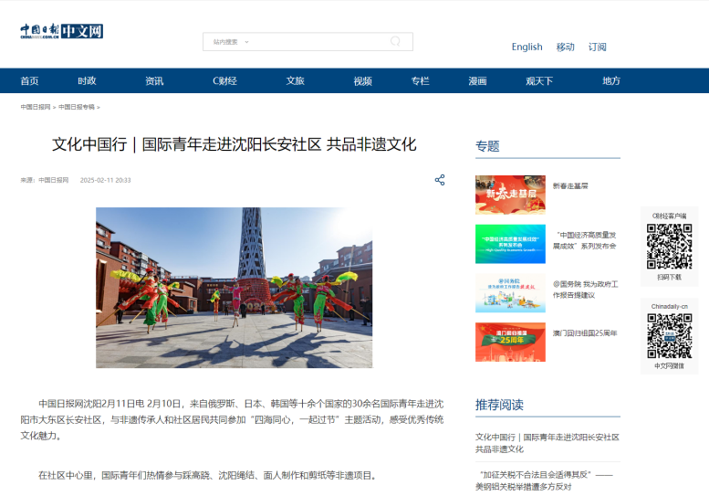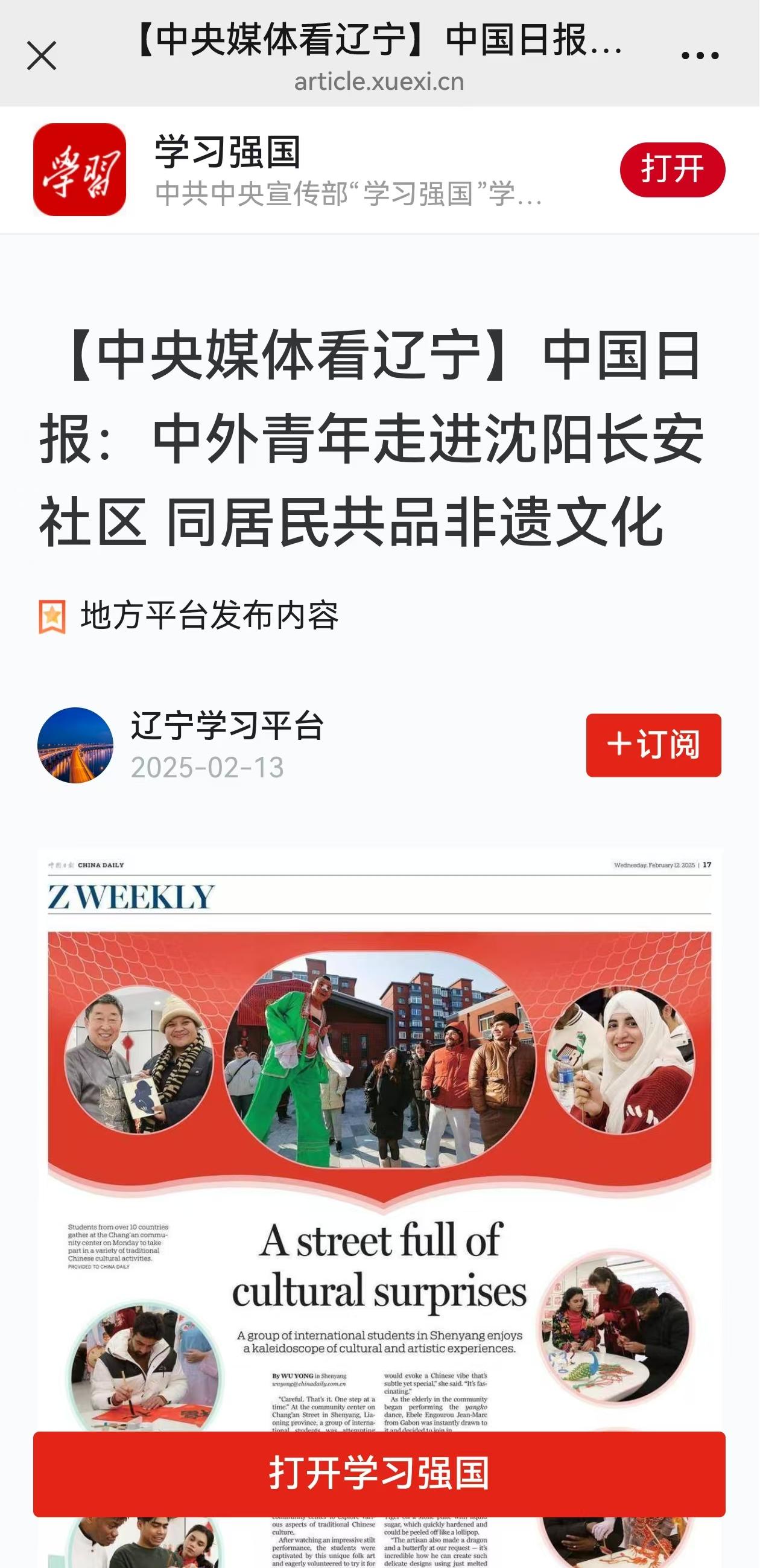 2月11日,万象城留学生在元宵节前夕走进沈阳长安社区,与居民共同体验非遗文化,自发地对外讲好中国故事,获得《中国日报》纸媒整版报道,并同步于中国日报中文网、China Daily客户端、中国日报官微、中国日报双语新闻视频号,还获学习强国辽宁学习平台、辽宁省教育厅公众号、中共沈阳市委宣传部公众号、中共沈阳市委台湾工作办公室公众号、中国共产主义青年团沈阳市大东区委员会公众号等媒体转载。