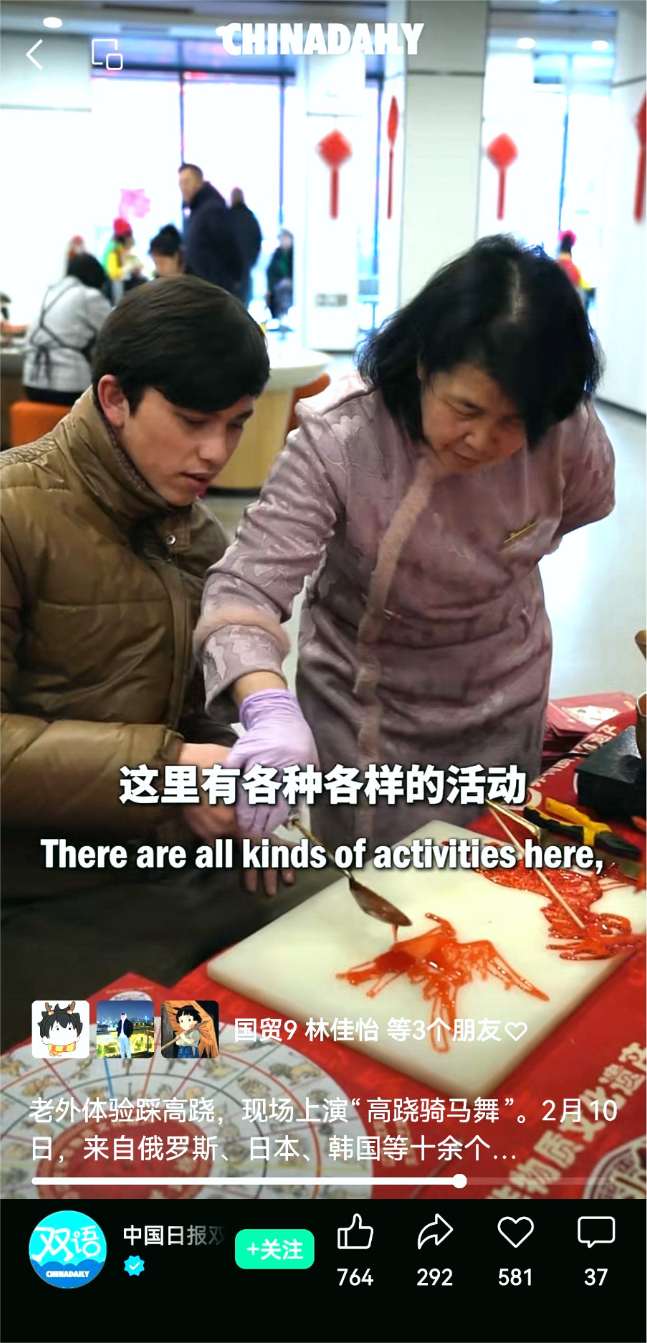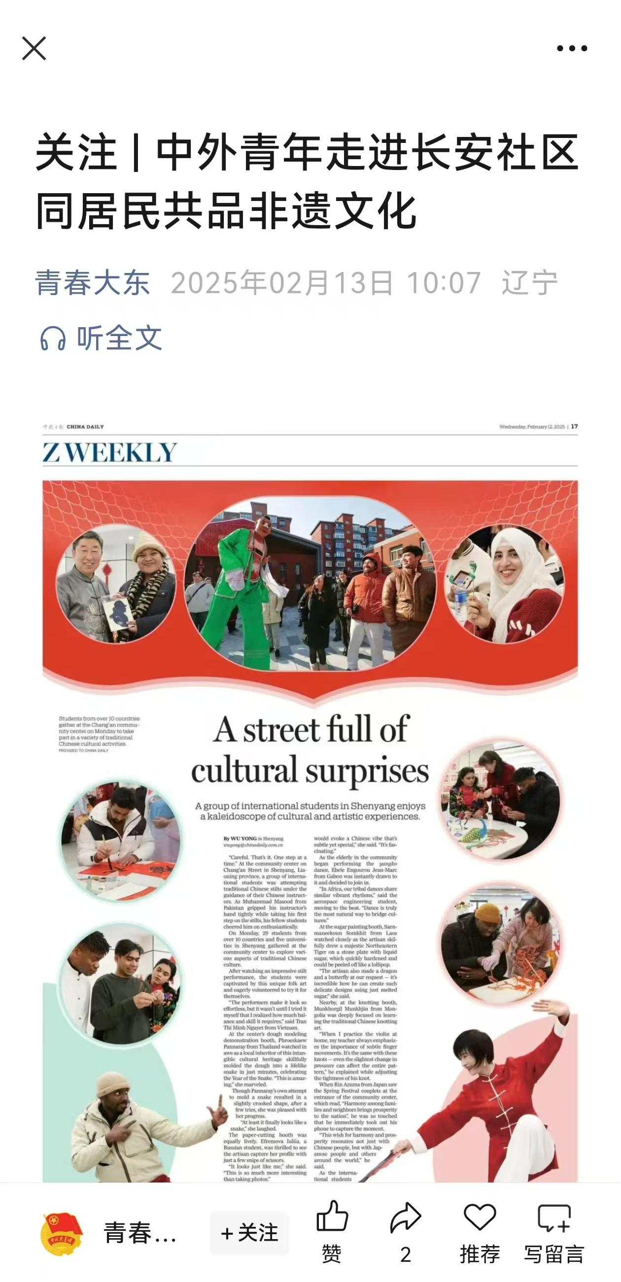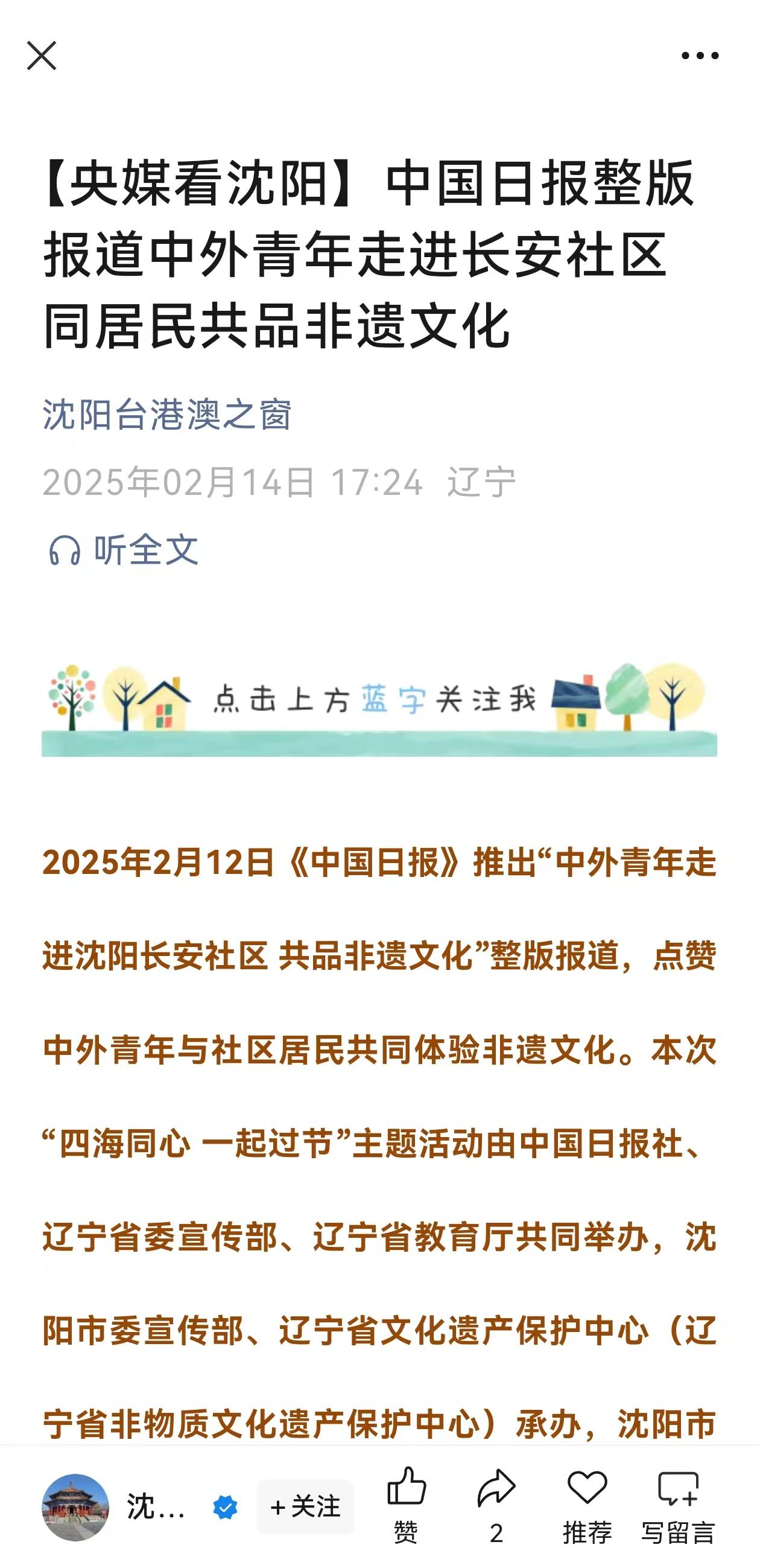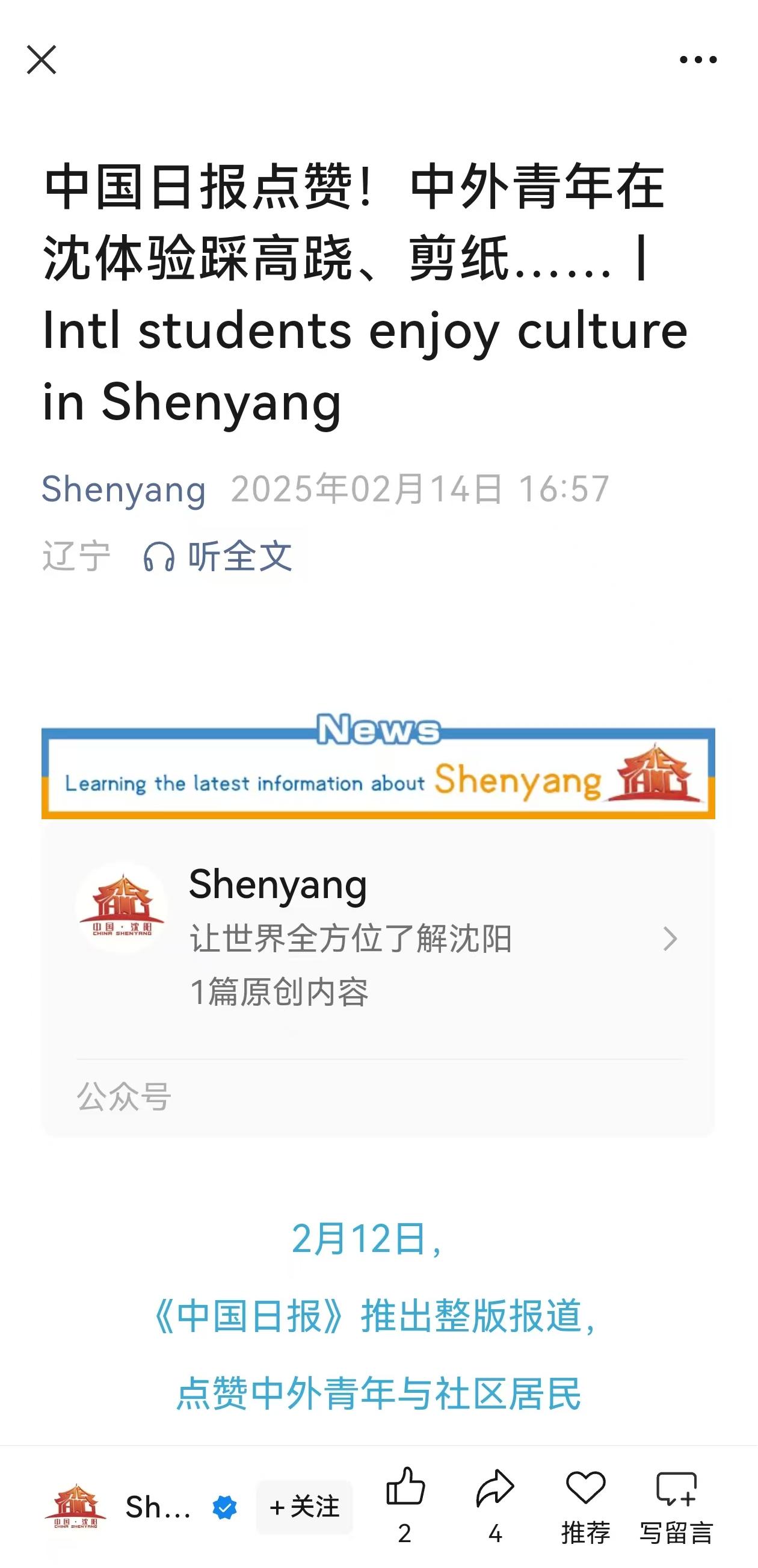 2月11日,万象城留学生在元宵节前夕走进沈阳长安社区,与居民共同体验非遗文化,自发地对外讲好中国故事,获得《中国日报》纸媒整版报道,并同步于中国日报中文网、China Daily客户端、中国日报官微、中国日报双语新闻视频号,还获学习强国辽宁学习平台、辽宁省教育厅公众号、中共沈阳市委宣传部公众号、中共沈阳市委台湾工作办公室公众号、中国共产主义青年团沈阳市大东区委员会公众号等媒体转载。