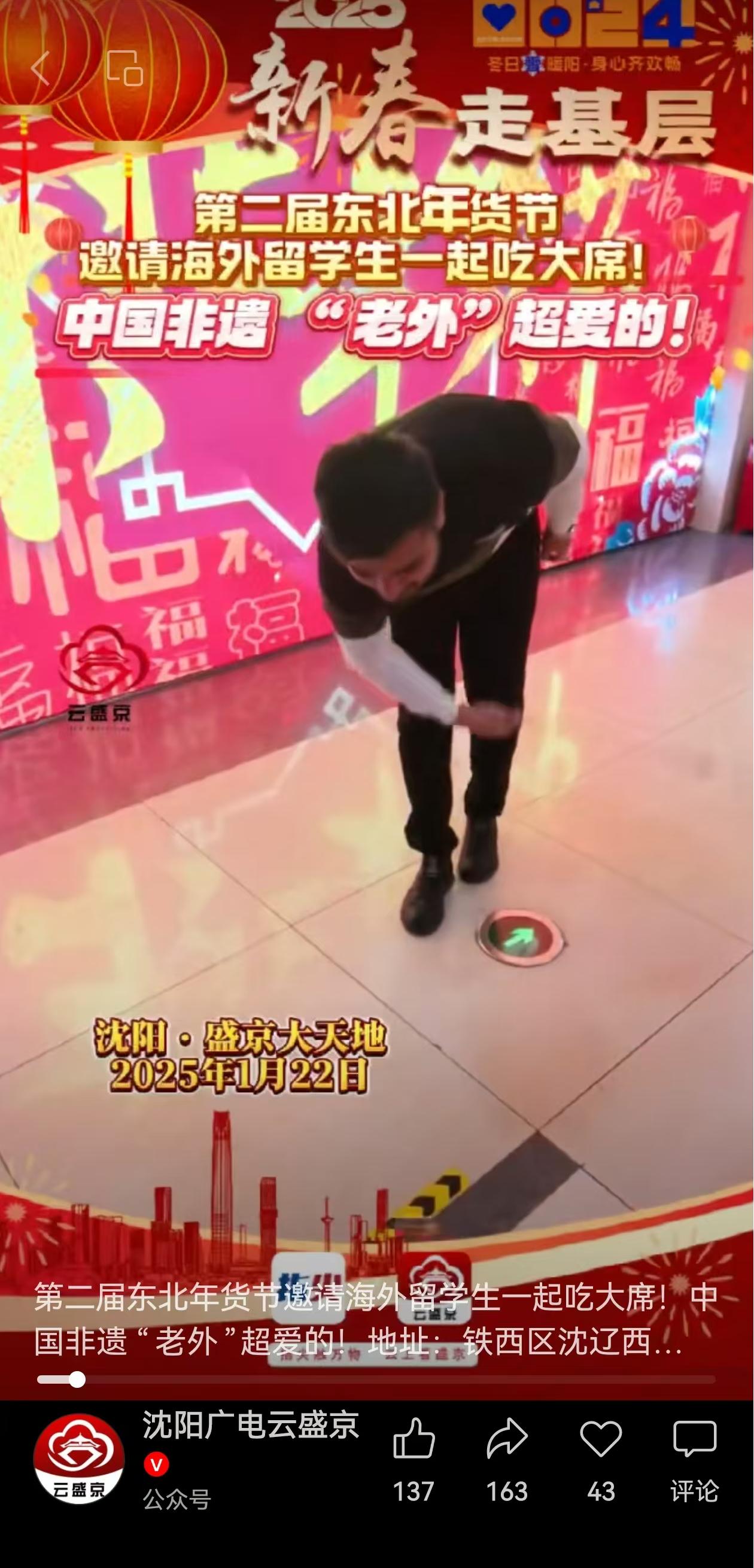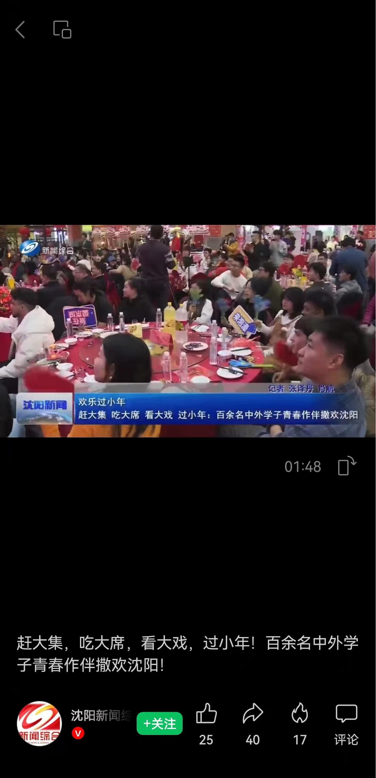 1月22日,万象城留学生受邀参加沈阳市文旅产业集团、沈阳电视台和团市委组织的“在沈留学生一起过大年”活动,品鉴辽宁十四个地区特色菜品,活动报道登上《沈阳新闻》,并在直播生活、沈阳新闻综合频道、沈阳广电云盛京等官方视频号上发布。