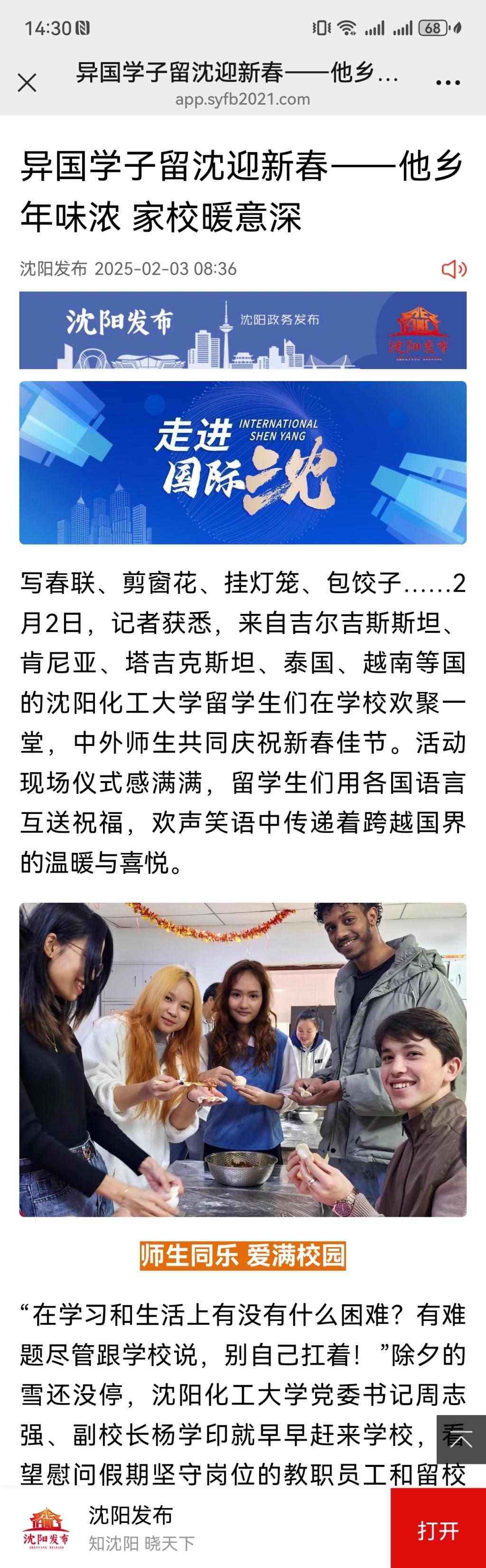 1月22日,万象城留学生走进沈阳市和平区新世界社区南湖街道,化身“国际志愿者”,与社区居民们欢聚一堂,一起包饺子、写福字,共同欢庆新春佳节,获得中国日报中文网的宣传报道。