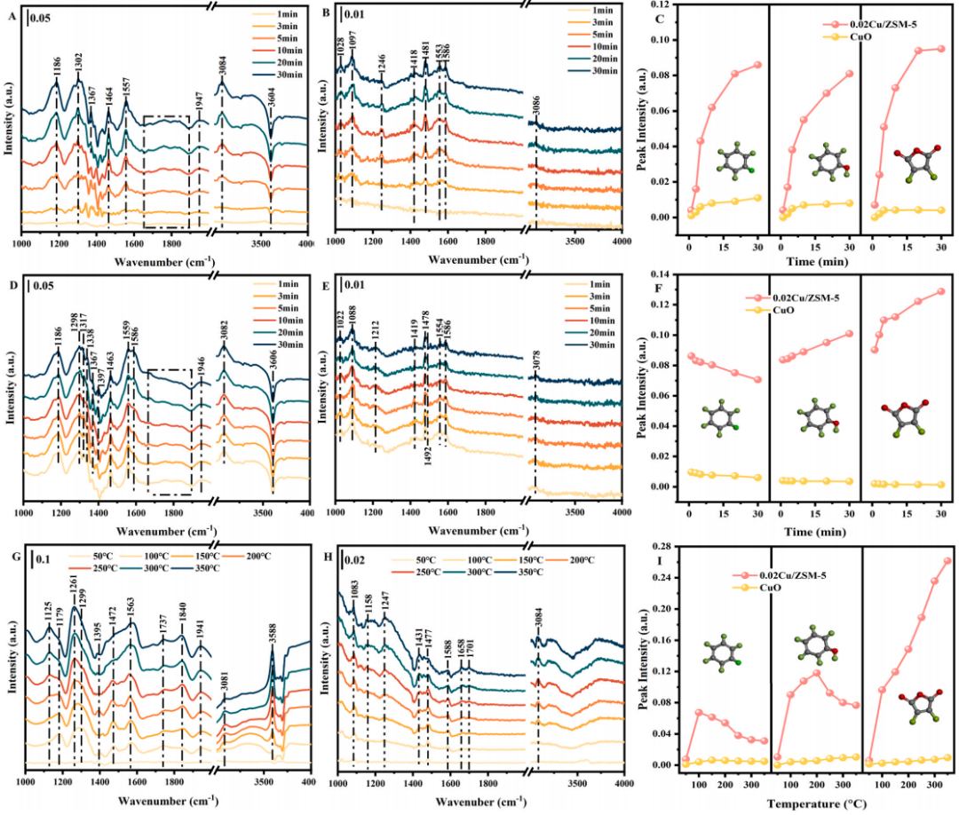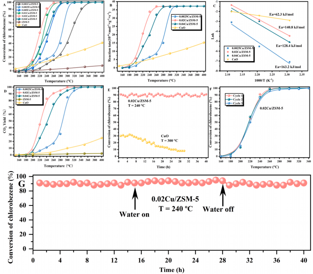 研究显示,0.02Cu/ZSM-5在240℃即可实现90%氯苯转化,并在连续40小时运行中表现出优异稳定性;相比之下,过量负载(0.04mol/L)易生成CuO团聚体,覆盖活性位并抑制氧迁移,导致性能下降(下图A、E与G)。
