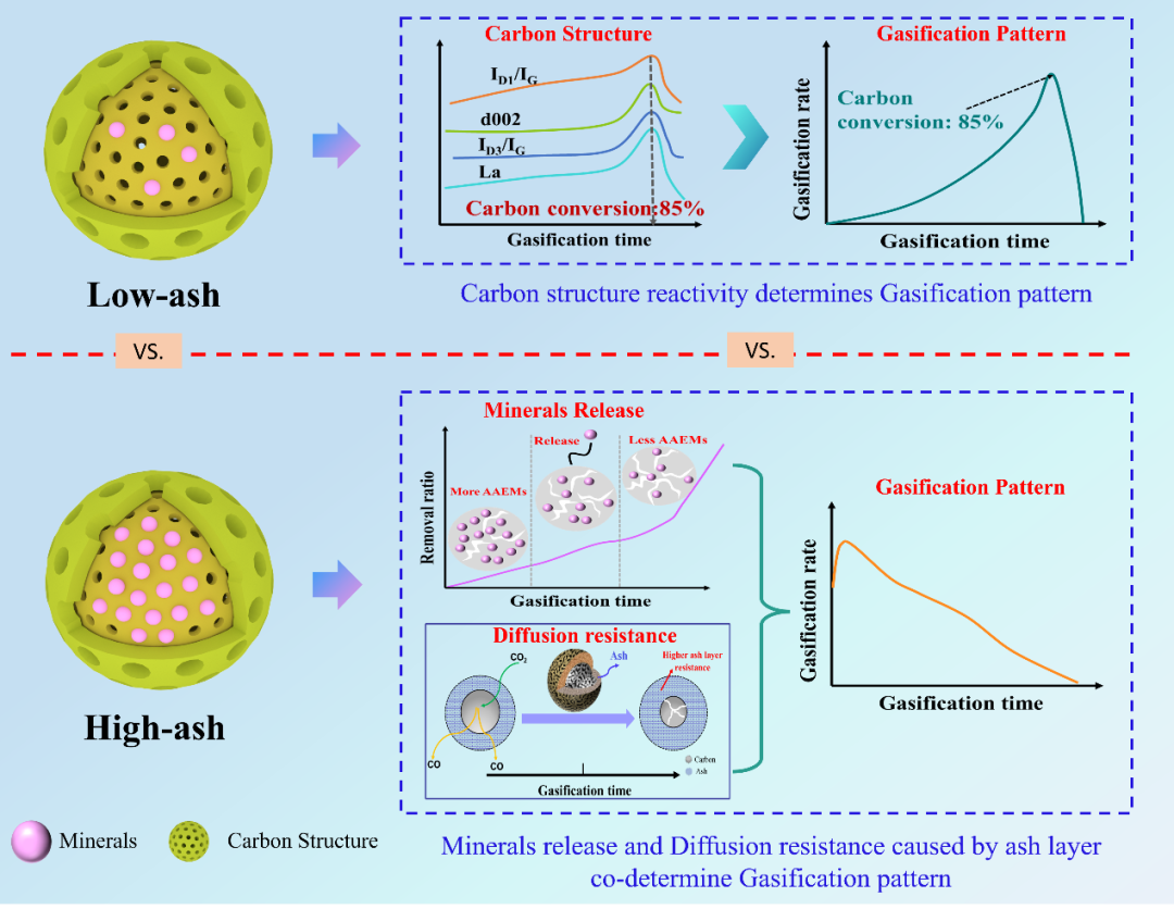 近日,万象城体育awcsport资源化工与材料教育部重点实验室,依托自主研发的在线颗粒采样微型反应流化床,系统探究了不同类型生物炭的气化动态演变规律,并揭示其差异产生的本质原因。研究发现,低灰分与高灰分生物炭的气化速率随时间演变曲线存在显著差异:低灰分生物炭表现出“下降-上升-下降”的变化特征,而高灰生物炭则呈持续下降趋势。当高灰分生物炭脱除矿物质后,其气化特性与低灰分生物炭高度吻合,这一结果证实灰分含量是导致不同生物炭气化演变规律差异的决定性因素。此外,团队还建立了不同类型生物炭气化的新机理:低灰分生物炭的气化速率演变由碳结构本征反应性主导;而高灰分生物炭在气化过程中,因催化活性矿物质逐步释放、灰层阻力持续增加,其气化速率随时间呈持续下降趋势。本文研究成果进一步丰富并完善了生物炭气化理论体系,为不同类型生物质气化技术的研发与应用提供了重要理论支撑和实践指导。