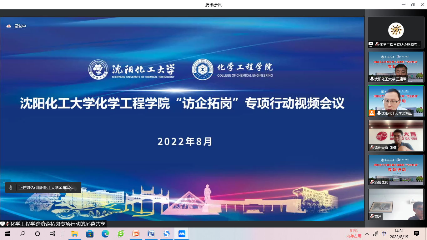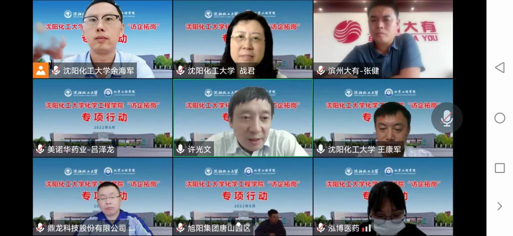 为贯彻落实党中央、国务院关于高校毕业生就业工作的决策部署,严格贯彻落实辽宁省教育厅有关“访企拓岗”的文件精神和万象城体育awcsport“访企拓岗”工作要求,加快健全毕业生市场化社会化的就业创业工作机制,开拓更多就业创业岗位和机会,8月19日,化学工程学院举办首次云端“访企拓岗”专项行动对接会。旭阳集团有限公司、首建农业集团有限公司、卫星化学股份有限公司、凯莱英医药化学技术有限公司、山东昌邑家园化工有限公司、宁波美诺华药业股份有限公司等20余家大型化工类企业代表参加了这次专项行动对接会。