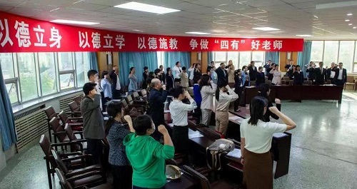 活动中,学院举行了师德宣誓和师德承诺仪式,校优秀教师姚爽带领全院教师庄严宣誓,一同重温人民教师誓词,每位教师在《教师师德承诺书》上签字,作出严守师德师风的郑重承诺。广大教师深刻认识到自己肩负的职责和使命,坚守为党育人、为国育才初心,锤炼教育报国之志,勇担立德树人使命。