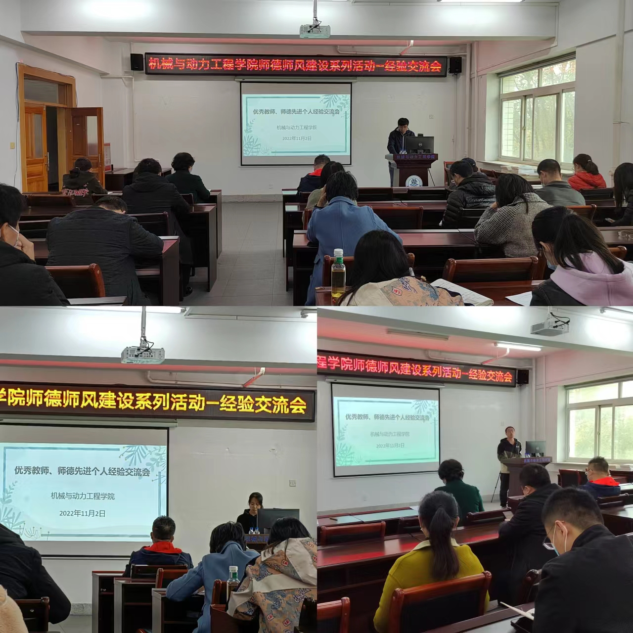 师德师风建设系列活动之二是经验交流会。11月2日,机动学院党委召开了师德师风建设系列活动之“优秀教师,师德先进个人”经验交流会。机动学院全体教师参加会议,会议由党委书记付广艳教授主持。会上,2022年度被评为优秀教师的李楷、李雅侠,获得师德先进个人的王树强三位老师分别作了交流发言。每个人从自己的工作实际出发,分享了毕业生就业、考研,教学及科研中解决问题的方法,取得的成绩,以及开展课程思政教学经验。党委书记付广艳教授作总结,要求全体教师学习他们的经验和做法,向“先进”看齐,立足岗位,再创佳绩,为党育人,为国育才。