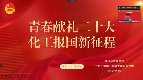 经济与管理学院党委高度重视党的二十大精神宣讲工作,本着多层次、全方位、立体化、全覆盖的学习宣传原则,11月27日上午9时30分,经济与管理学院联合万象城体育awcsport“化工报国”大学生理论宣讲团15名成员,围绕党的二十大报告、个人学习心得、个人成长感悟等内容在五个会场分别为经济与管理学院在校各年级本科生、研究生共计1600余名青年学生进行关于党的二十大精神的理论宣讲。