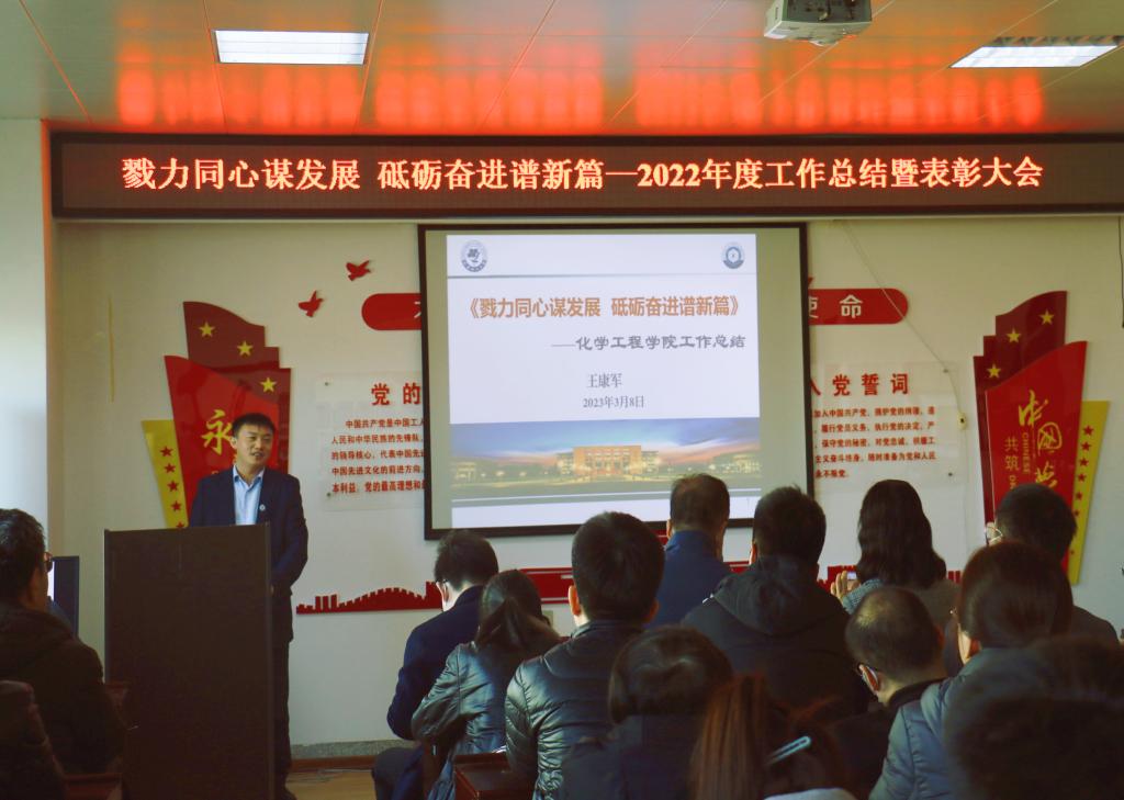 院长王康军又详细分析了学院发展中存在的问题和不足,并对学院2023年重点工作做出部署。他强调,一要坚持政治引领,确保学院始终成为坚持党的领导的坚强阵地;二要聚焦立德树人根本任务,坚持需求导向,优化专业结构,凝练专业特色,强化专业内涵建设,提升人才培养质量;三要实施人才强院核心战略,全院教师全力推进人才引进工作,强化师资队伍建设;四要统筹谋划双一流学科建设和博士点建设,凝练学科方向,打造学科团队,充分发挥学科建设的引领作用,提升学院科技创新和服务国家经济和社会发展能力;五要全面推进开放办学,充分利用“科教”和“产教”两个平台,持续推进4+0国际办学;六要完善学院制度建设,强化学院内部治理,提升学院发展合力。他期望全院上下继续秉持勠力同心、砥砺奋进的优良作风,开拓进取,奋发图强,铸就化工创辉煌,续写化工发展新华章,全面助力推进学校实现“腾飞之梦、强校之梦、名校之梦”的宏伟蓝图!
