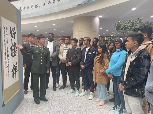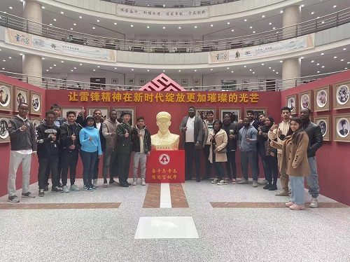 4月20日上午,国际教育学院组织来自巴基斯坦、坦桑尼亚、尼日利亚等国家20余名留学生参观了学校在图书馆举办纪念毛泽东等老一辈革命家为雷锋同志题词60周年书画展暨雷锋文化艺术视觉展,辅导员窦东参加本次活动。
