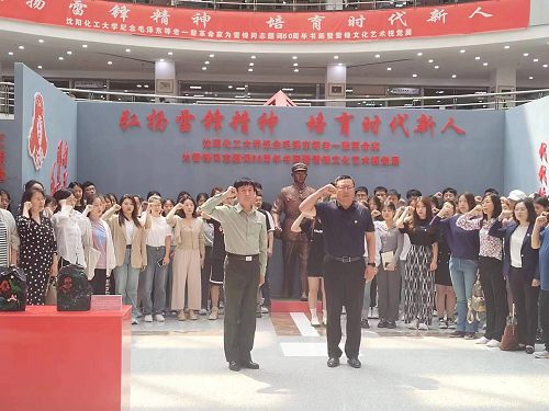 进入图书馆大厅,迎面映入眼帘的是昂首站立的“雷锋”铜色塑像,右侧高大展板镌刻着展览主题,左侧是参观人员留下的签名纪念。参观之前,与会师生伫立在雷锋雕像前,认真聆听吴锡有老师声情并茂讲述学雷锋感想。在敬意的目光中,师生们举起右手,在领誓人吴锡有老师带领下庄严宣誓:“学习雷锋,传播温暖和爱心,做一粒种子,将雷锋精神播撒在祖国大地……让雷锋精神永续传承!”