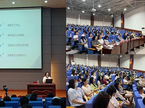 王蓉副院长认真备课、精心准备,为有考研意愿的近千名经管学生上了一堂生动的考研动员课,她从“考研为了什么”“考研成功上岸密码”“学院硕士点的比较优势”“学院能为大家做什么”等方面,向学生们作了全方位考研动员阐释。王蓉副院长向莘莘学子抛出助力考研“橄榄枝”,列出了经济与管理学院计划从今年7月开始,为同学们提供考研的服务清单,即落实“助考六件事”:组织教师针对专业难点重点,以线上线下相结合的方式对考研学生进行免费专业指导(数学、英语、专业课);对有需要的同学展开心理辅导,通过一对一谈话或集体班团会的形式放松考研心情;组织考研“导师团”,导师提前“认带”学生,对学生进行个性化学习指导;学生提前“认找”导师,选好专业方向提振学习热情;建立学习交流群,搭建答疑解惑、交流经验平台,为考研学生提供专业指导,给予合理规划和建议;改造考研复习专用自习室,为学生提供良好学习环境;公布院长信箱,及时回应同学们关切的问题,倾听学生心声,帮助学生解决考研等方面的问题。