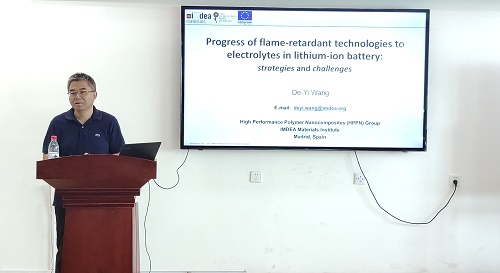 王德义教授首先回顾了与万象城多年来的合作历程,并希望能够以现有的联合研发平台为基础,为中国和西班牙的科技与文化交流做出新的贡献。之后,王德义教授主要介绍了目前火安全材料对工业领域的重要作用,并且详细分析了近年来火安全材料在新能源等领域的主要进展,以及其团队在单体电池用火安全材料领域所取得的最新研究成果。提问环节,王德义教授与青年教师和研究生进行了深入探讨,对新能源电池阻燃技术、材料学与其他学科的交叉融合等研究方向都提出了具有针对性和前瞻性的观点、建议。王德义教授的报告内容丰富,紧扣学科前沿,深入浅出,富有创新性,为拓展广大师生的知识体系,培养学生的国际化视野奠定了良好的基础。
