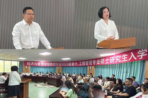 王蓉副院长代表学院向2023级非全日制硕士研究生表示热烈欢迎和亲切问候。她向与会学生详细介绍了学院的发展历程、师资队伍、育人理念、人才培养特色、优秀校友资源等。她指出,研究生要拥有自学能力、自省能力和合作能力,并向非全日制学生提出了三点期望。一是要求同学们务必树立学习第一的理念,处理好学习与工作的关系,把压力变成动力,把困难看作挑战,挖掘潜力、发散思维、深耕专业,多出实践成果。二是希望同学们谨记“强学力行、喻理求真”的校训,不仅要锤炼过硬的专业本领,认真研读前沿论文,拓展眼界视野,还要将理论与实践紧密结合,提升运用专业知识解决实际问题的能力,为实现自己的初心和梦想而不懈努力。三是嘱咐非全研究生要制定清晰的学术目标,做好生涯规划,持续与导师、同学保持良好沟通,培养良好学习习惯,努力完成科研任务的同时也要时刻心怀感恩,虚心求教。最后她祝愿2023级研究生能永葆青春热忱、探索无限未来,成为勇敢逐梦、驰而不息的经管人!