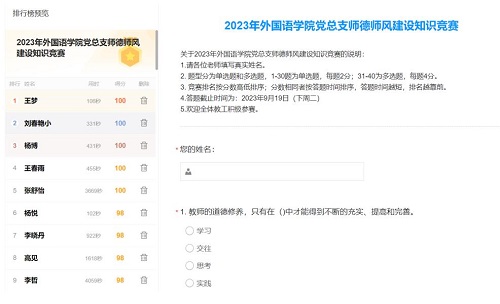 本次竞赛是学校“优师计划”--2023年教师发展项目《以“党建+”模式引领推动新时代高校师德师风建设,打造“五心”示范品牌》的重要活动之一。竞赛通过“问卷星”APP进行,外国语学院、国际教育学院全体教工参加了比赛,参与率达到100%。题型包括单选和多选题,内容涵盖了习近平总书记关于师德师风的重要论述、《新时代高校教师职业行为十项准则》、《高等学校教师职业道德规范》等文件中的重点内容。