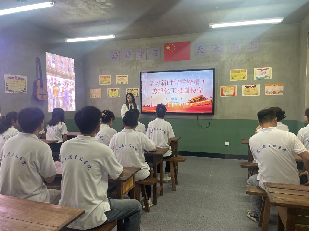 郭苗苗从教学目标、设计理念、主要内容和实施情况等对《思想道德与法治》课程的实践教学环节进行了介绍,并深入阐释了雷锋精神融入德法课实践环节的必要性和可行性。在教学展示环节,学生依托“平凡身影”“精神永恒”“华彩人生”“星空璀璨”四个展厅开展学习交流,深刻感悟雷锋精神的精神伟力。随后,郭苗苗依托“信念角”和“化工报国”展厅开展了题为《学习新时代雷锋精神 勇担化工报国使命》的专题思政课,勉励学生坚定不移听党话、跟党走,把“小我”融入到为人民谋幸福、为民族谋复兴的“大我”之中,在强国建设、实现复兴伟业中贡献自己的力量,书写“化工报国”的无悔青春!