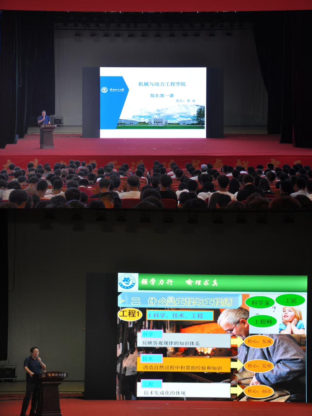 院长龚斌以三大核心问题为引,为新生系统勾勒出专业领域的全景图景与成长航向。他从1952年学院前身化工机械系的创办溯源,回溯七十余载深耕工科教育、赋能产业发展的历程,通过“国家级教学名师领衔的优质师资团队”“斩获国家科学技术进步奖的标志性科研成果”等鲜活实例,让新生具象化感知学院的学科硬实力与专业吸引力。同时,他紧扣“工程导论”核心要义,悉心解读工程“联结理论与实践”的本质,阐明工程师“守正创新、担当实干”的时代责任;既结合机械与动力工程领域智能化升级、绿色化转型的行业趋势,又亮出学院95%以上的高质量就业率,为新生清晰绘制出从“校园学子”到“合格工程师”的成长路径图。最后,他以“强学力行,喻理求真”校训为纲,勉励新生潜心钻研专业知识,在实践中锤炼过硬本领,为未来扎根领域、赋能产业发展筑牢坚实根基。