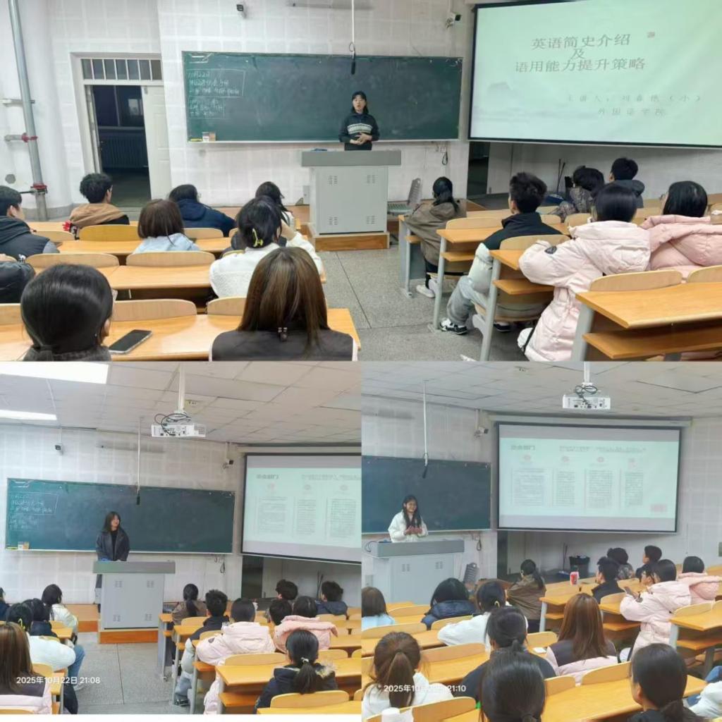 随后,刘春艳以“英语简史介绍及语言能力提升策略”为主题开展学术讲座。讲座通过四大历史阶段(古英语-中古英语-早期现代英语-现代英语)解析英语演变逻辑与发展脉络。