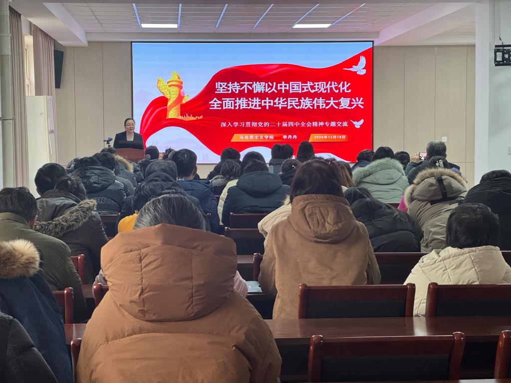 12月18日,化学工程学院在鸣龙楼208会议室召开学习贯彻党的二十届四中全会精神宣讲报告会。会议特邀学校学习贯彻党的二十届四中全会精神宣讲团成员、马克思主义学院季丹丹教授作专题宣讲。报告会由学院党委书记战君主持,学院全体教师参加。