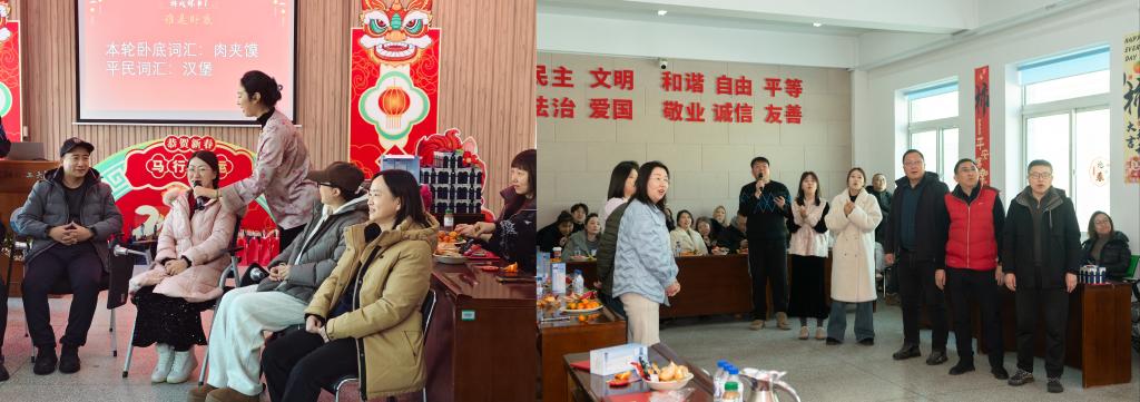 联欢环节内容丰富、精彩纷呈,各教研室精心准备的节目依次上演。学工办老师们以活力四射的魔术表演瞬间点燃现场气氛,展现出多才多艺的一面。社会工作专业带来小合唱《荷塘月色》,悠扬旋律传递出温馨惬意。互动游戏环节同样热闹非凡,“谁是卧底”“听音识曲”两轮趣味比拼轮番上演,通过随机抽取座位序号的方式邀请师生参与,大家积极互动、各展所长。现场笑声与掌声不断,充分展现了教职工积极向上的精神风貌。压轴节目是学院领导班子与本研主席团成员共同献唱《光阴的故事》《明天会更好》,师生联袂用深情的歌声表达了对全体教职工的由衷敬意和新年祝福,用歌声回望过往、寄语未来。