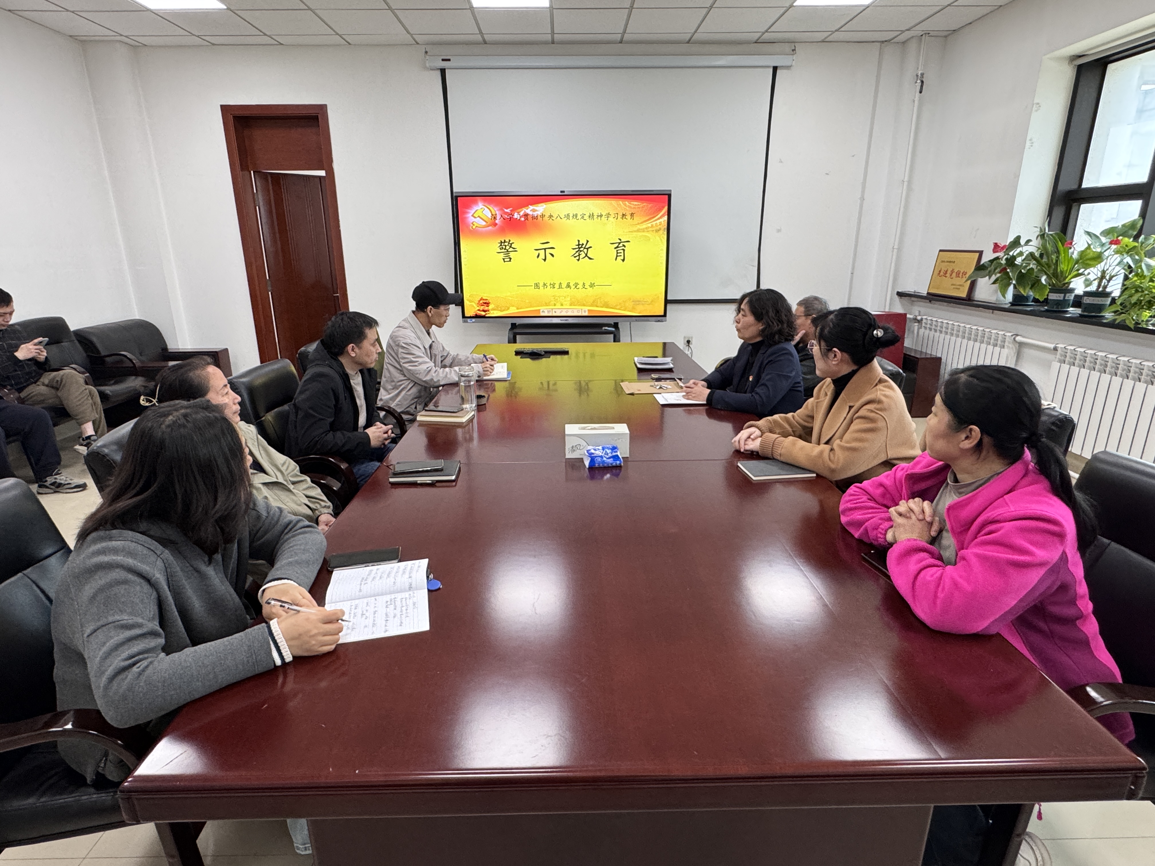 为深入学习贯彻习近平总书记关于党风廉政建设的重要论述,扎实开展深入贯彻中央八项规定精神学习教育,4月16日上午,图书馆直属党支部在504会议室组织全体馆员集中观看警示教育片《永远吹冲锋号》第三集《铁规矩硬杠杠》。